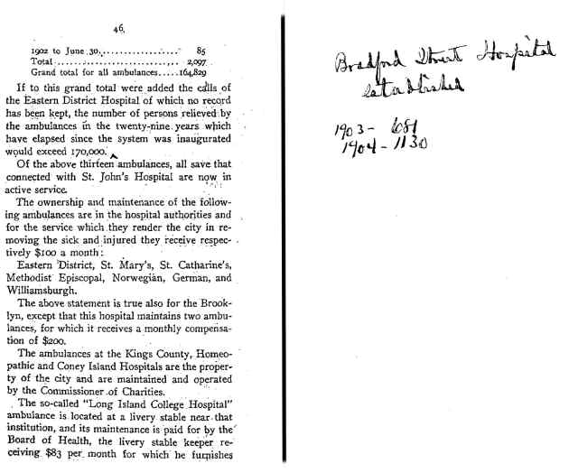 Ambulances of Eastern District, St. Mary’s, St. Catherine’s, Methodist, Episcopal, Norwegian, German, and Williamsburg Hospitals are owned by the hospital, and receive $100/month. Brooklyn Hospital supports two ambulances and receives $200/month.