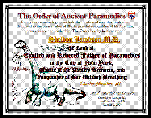 Among his lifetime of contributions to emergency medicine—teacher, professor, chief of service, author, lecturer and mentor, it is as Father of the New York City Paramedic Program that all the Jacobi medics will remember him. As to that dismal advice about resuscitation given me in my rookie years, thousands of New Yorkers who have been resuscitated by New York City paramedics have Sheldon Jacobson to thank for teaching that, sometimes, you can postpone the inevitable.
