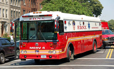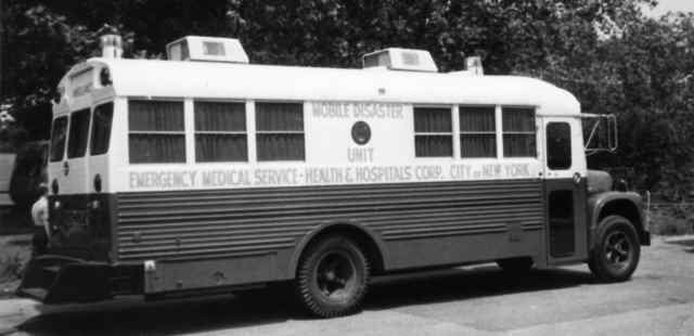 MERV’s are essentially large ambulances built on a bus chassis, capable of treating or transporting multiple patients at the scene of an MCI. The first units were built in the early 70’s and stationed at Bellevue Hospital, Kings County Hospital, Jacobi Hospital, and Queens General Hospital. In the 80’s, a fifth MERV was added at Metropolitan Hospital and in the late 90's at Station 52 in Staten Island. MERV 3 pictured above, was built on a former bookmobile acquired from The Brooklyn Public Library.