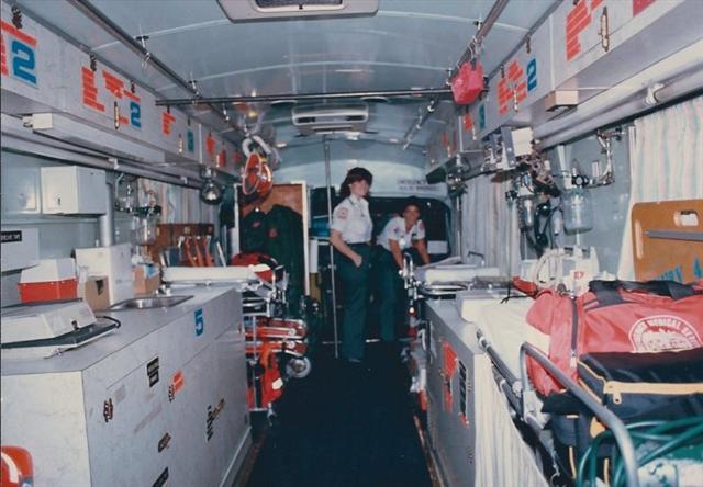Medic One and Medic Two went into service at Bronx Municipal Hospital (Jacobi Hospital) on July 7,1974, capable for the first time of recording and interpreting EKG’s, defibrillation and cardioversion, intravenous therapy, and administration of medications to control cardiac arrhythmias, support blood pressure, correct diabetic emergencies, allergic reactions, narcotic overdoses, seizures and severe respiratory problems. Early equipment was heavy and cumbersome compared to that used today. The Physio-Control LifePak 4 weighed 45 lbs compared to a Lifepak 12 which weighs 18 lbs. Medics also carried a large 747 fishing tackle box for drugs, and a dual tank Robertshaw demand valve/resuscitator. They also pioneered the use of nitrous oxide in the field as a non-narcotic analgesic.