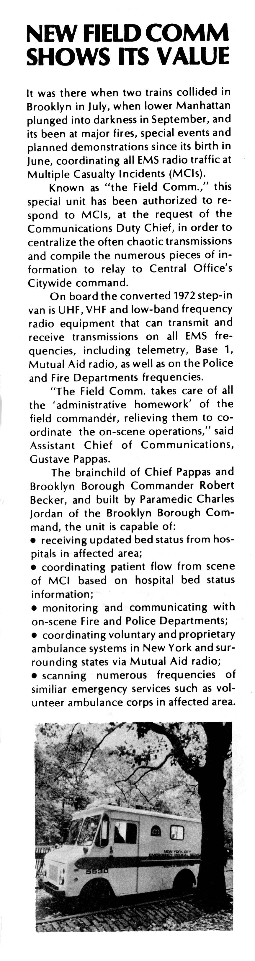 This unit serves as both an EMS command post, and a central information gathering point at the scene of an MCI. It is staffed by EMS Communications personnel and equipped with radios capable of communicating with Fire and Police units, as well as all EMS units. The Fieldcom will coordinate operations within the various EMS sectors(Triage, Staging, Treatment, Transport, Logistics, Safety) and potentially hundreds of EMS personnel at a scene, on low power local radio frequencies which will not interfere with normal continuing 911 assignments.Fieldcom will then only transmit pertinent information over the citywide MCI frequencies to the EMS Communications Center.