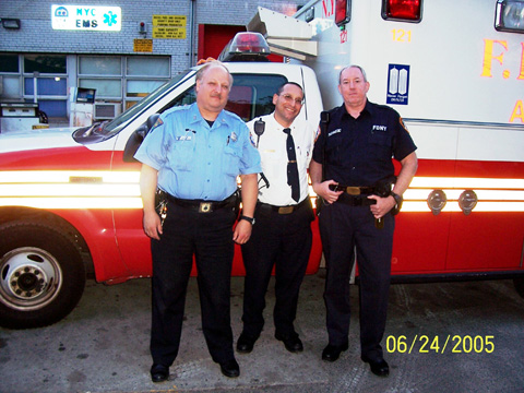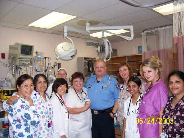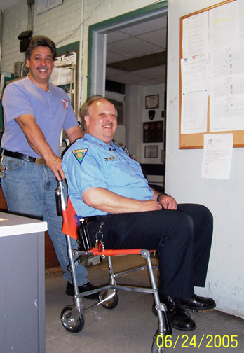 Mike Talletti wheels me out at the end of my shift... on my prototype 4 wheel stair chair manufactured by Ferno.
